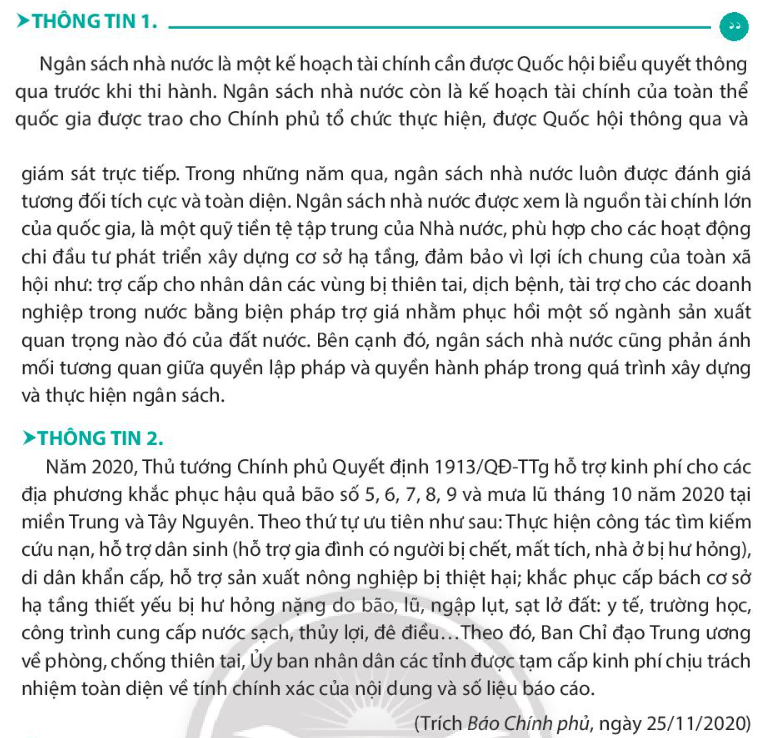 – Đọc thông tin 1 và xác định cơ quan nhà nước có thẩm quyền thông qua dự toán ngân sách và giám sát ngân sách nhà nước.