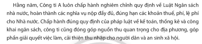 + Hành vi chưa hoàn thành nghĩa vụ ngân sách nhà nước của Doanh nghiệp A là hành vi vi phạm Luật Ngân sách nhà nước. Bởi Doanh nghiệp A chưa thực hiện nghĩa vụ nộp các khoản thuế, phí, lệ phí vào ngân sách nhà nước theo quy định của pháp luật.