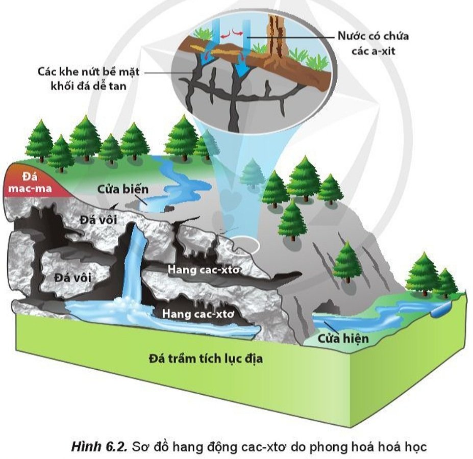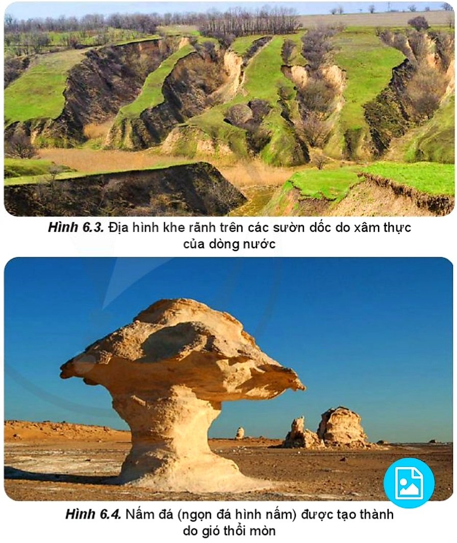 Đọc thông tin và quan sát hình 6.1, 6.2, hãy trình bày tác động của quá trình phong hóa đến sự hình thành địa hình bề mặt Trái Đất.