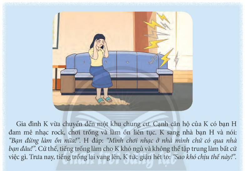 – K trở nên tức giận và dễ nóng tính bởi vì: cạnh nhà bạn K có bạn H đam mê nhạc rock, đánh trống làm ồn ào, ảnh hưởng đến cuộc sống hằng ngày của bạn.