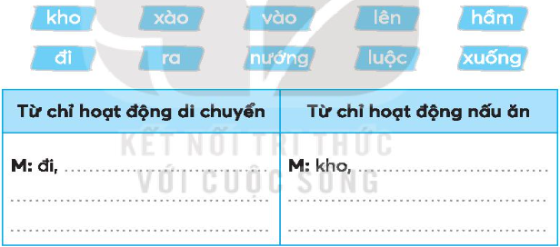 Tìm những từ ngữ chỉ hoạt động kết hợp được với mỗi từ chỉ sự vật theo mẫu. Xếp các từ chỉ hoạt động dưới đây vào 2 nhóm. Chọn từ ở bài tập 2 điền vào chỗ trống. Chọn lần lượt trong mỗi hàng 1 từ, ghép các từ để tạo thành câu. Đọc bài thơ Vào bếp thật vui hoặc tìm đọc sách dạy nấu ăn hoặc những bài đọc liên quan đến công việc làm bếp và viết thông tin vào phiếu đọc sách.