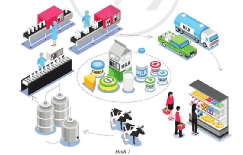 Trang trại bò vắt sữa -> Vận chuyển đến nhà máy để bảo quản -> Chế biến -> Đóng gói thành phẩm -> Vận chuyển đến các chợ, siêu thị,.. để bán.