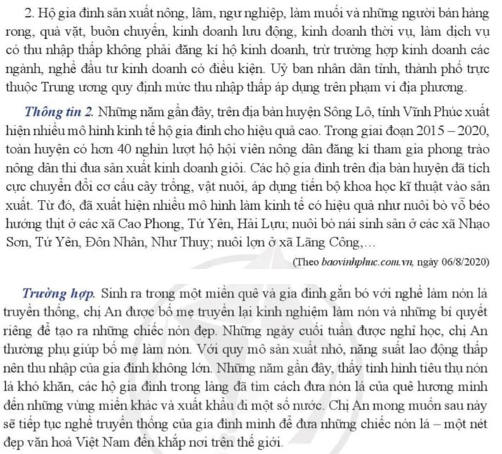 – Liệt kê lĩnh vực sản xuất kinh doanh của mô hình kinh tế hộ gia đình ở thông tin 2 và trường hợp trên.