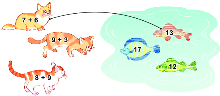 Tính mỗi phép tính ở mèo rồi tìm xem kết quả phép tính đó trùng với số nào ở cá rồi nối mèo với cá tương ứng.