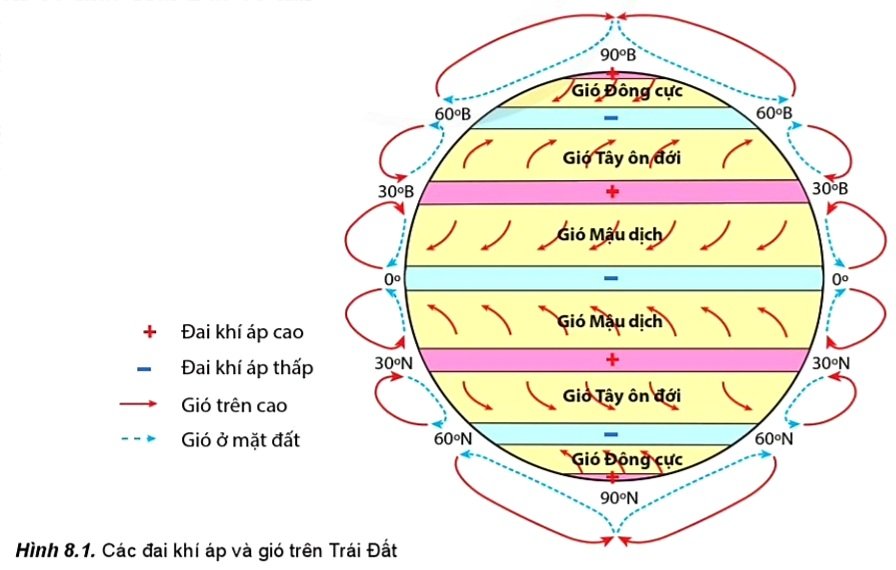 Đọc thông tin trên và quan sát hình 8.1, hãy trình bày sự hình thành các vành đai khí áp trên Trái Đất.