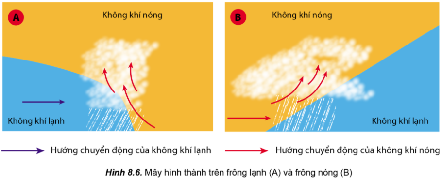 + Dọc các frông nóng/lạnh, không khí nóng bị đẩy lên cao tạo thành mây và gây mưa (mưa frông).