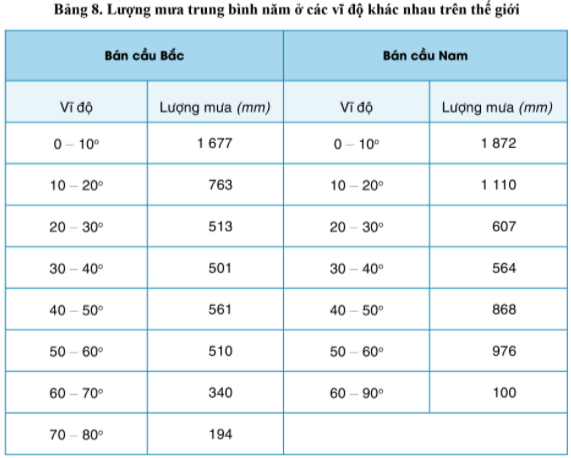Đọc thông tin trong mục “Phân bố mưa theo vĩ độ” và quan sát bảng 8.