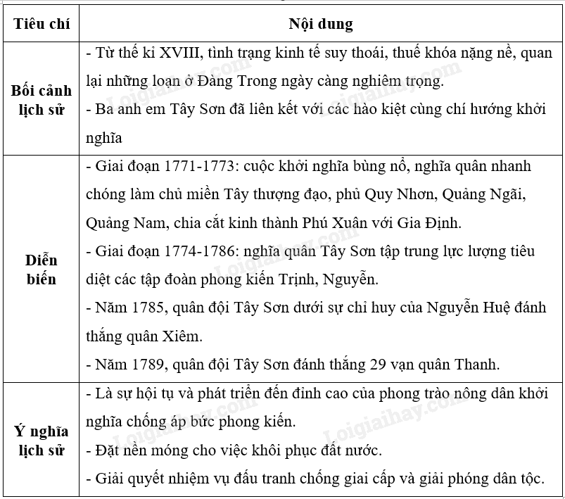 Bảng tóm tắt bối cảnh lịch sử, diễn biến chính và ý nghĩa của cuộc khởi nghĩa Tây Sơn: