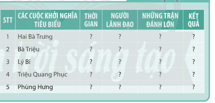Hoàn thành bảng tóm tắt nội dung chính của cuộc khởi nghĩa tiêu biểu trong thời kì Bắc thuộc theo gợi ý bên: