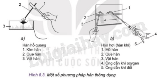 Quan sát Hình 8.3, mô tả sự giống và khác nhau của Phương pháp hàn hồ quang tay và hàn hơi.