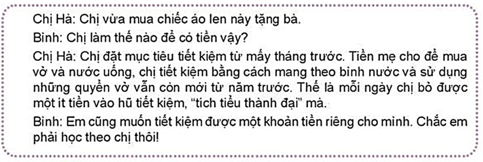 – Đọc đoạn hội thoại và nhận xét về mục tiêu tiết kiệm tiền và cách thực hiện của chị Hà.