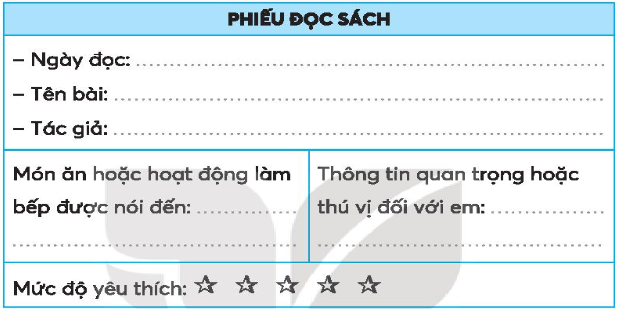 Đọc sách dạy nấu ăn hoặc những bài đọc về công việc làm bếp và viết thông tin vào phiếu đọc sách.