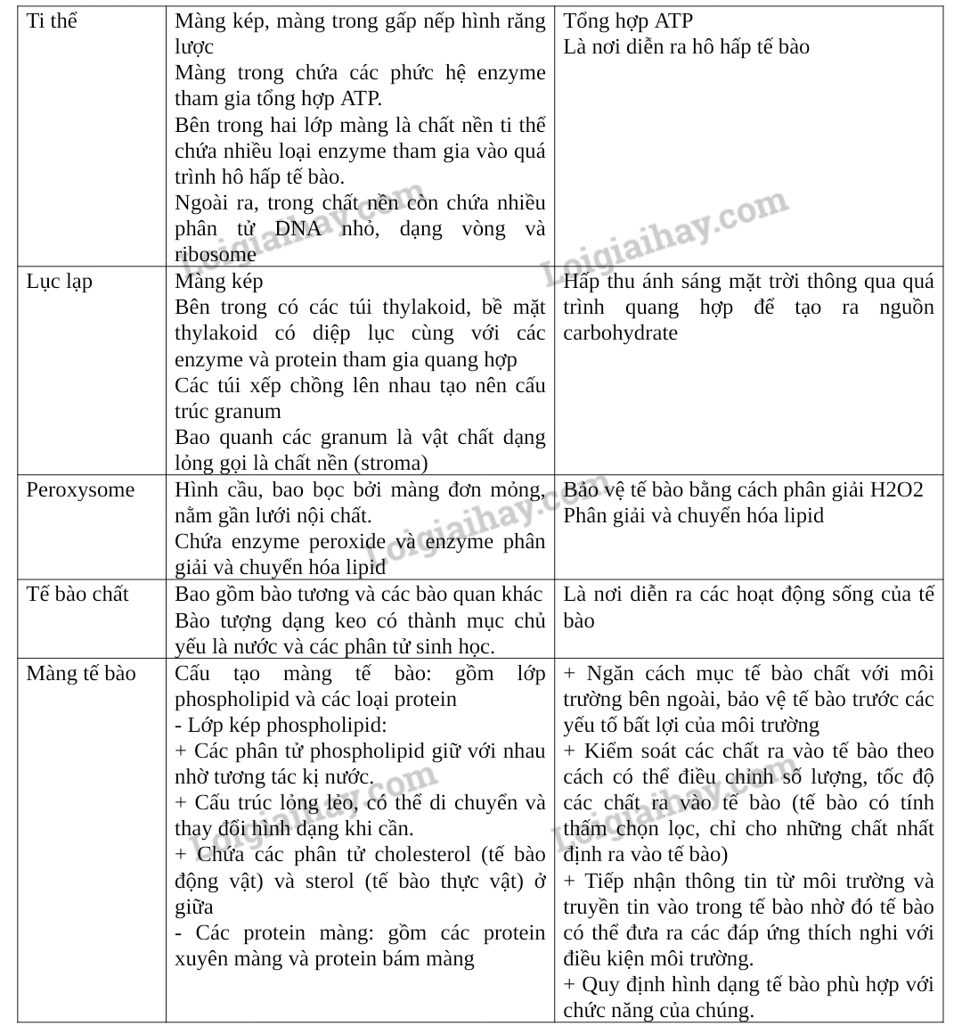 Câu 1. Lập bảng hệ thống cấu trúc và chức năng của các bào quan trong tế bào nhân thực.