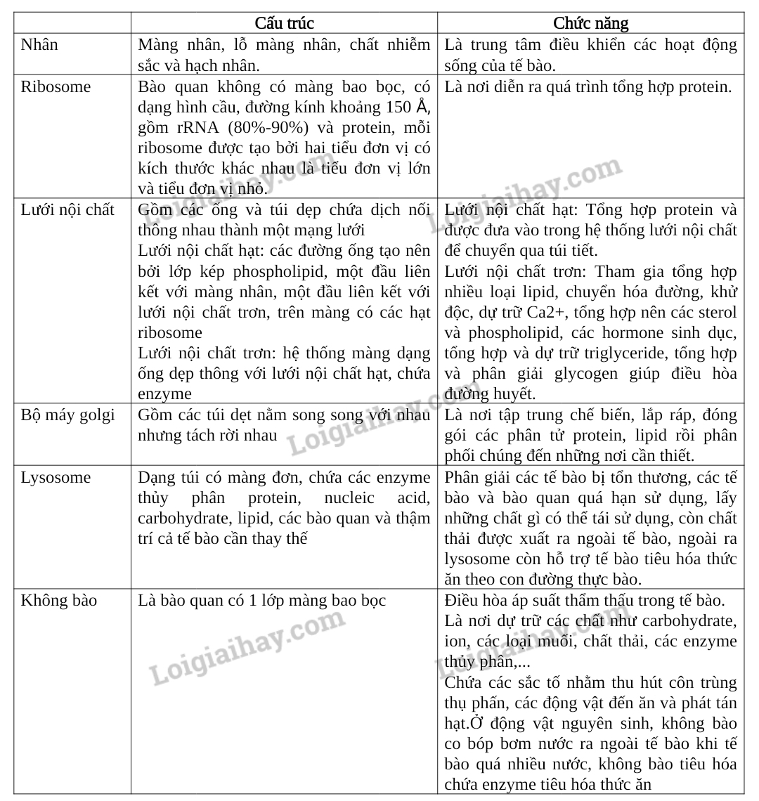 Câu 1. Lập bảng hệ thống cấu trúc và chức năng của các bào quan trong tế bào nhân thực.