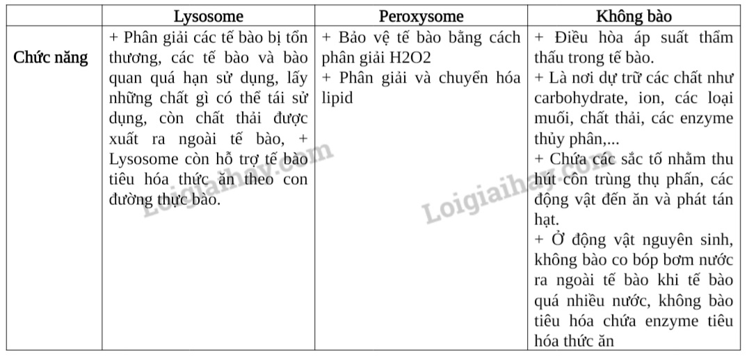 Câu 3. So sánh chức năng của các bào quan: lysosome, peroxysome và không bào.