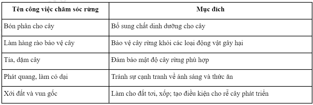 Hoàn thành vào vở tên công việc chăm sóc rừng theo mẫu trong bảng.