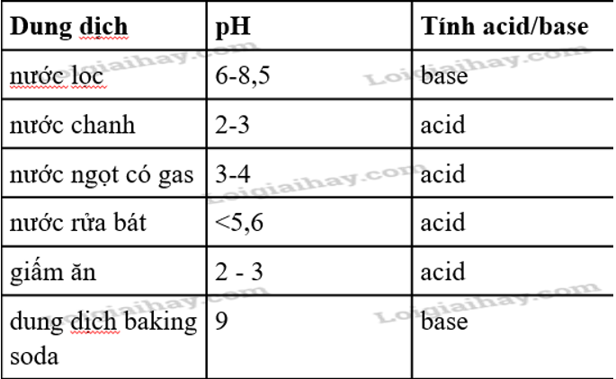 1. Đọc giá trị pH của từng dung dịch và cho biết dung dịch nào có tính acid, dung dịch nào có tính base. Điền vào bảng thông tin sau đây