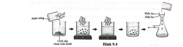 Để tinh chế chất hữu cơ rắn chứa tạp chất, người ta hoà tan chất rắn trong dung môi thích hợp rồi lọc bỏ tạp chất không tan (Hình 9.3)