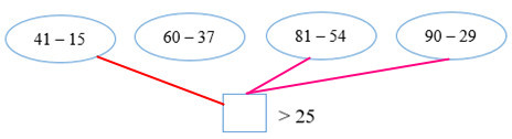 Tính kết quả các phép trừ trong hình, rồi so sánh với 25, nếu kết quả lớn hơn thì nối với ô vuông.