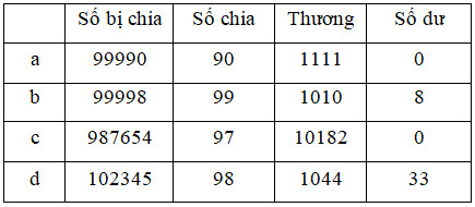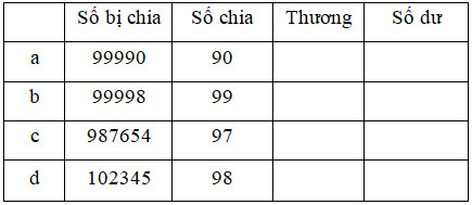 Thực hiện các phép chia và điền thương và số dư vào chỗ trống.