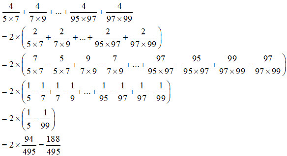 \(\dfrac{4}{{5 \times 7}} + \dfrac{4}{{7 \times 9}} + …\)\( + \dfrac{4}{{95 \times 97}} + \dfrac{4}{{97 \times 99}}\)