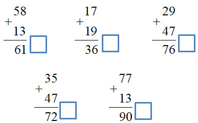 \(\begin{array}{l}\underline { + \begin{array}{*{20}{c}}{27}\\{49}\end{array}} \\\,\,\,\,\;76\end{array}\)                                    \(\begin{array}{l}\underline { + \begin{array}{*{20}{c}}{57}\\{26}\end{array}} \\\,\,\,\,\;83\end{array}\)