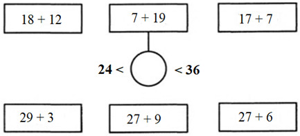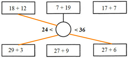 Thực hiện các phép tính trong ô rồi so sánh : Nếu kết quả lớn hơn 24 và nhỏ hơn 36 thì nối với hình tròn.