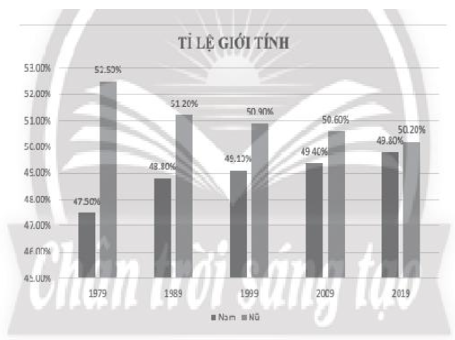 – Dạng biểu đồ tròn (hình 3) thường không dùng thay thế cho biểu đồ cột (hình 1) hoặc biểu đồ đường (hình 2) và ngược lại, vì biểu đồ tròn mô tả tỉ lệ các thành phần trong một tổng thể (100%) trong khi hai loại biểu đồ kia không có tác dụng như vậy. Tuy nhiên, cần lưu ý, trong trường hợp này, chúng ta vẫn có thể dùng biểu đồ cột để mô tả các số liệu về tỉ lệ giới tính trong biểu đồ tròn (hình 3) như sau: