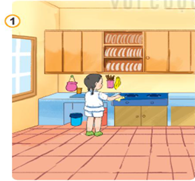 Bạn nhỏ trong hình đã biết bảo quản đồ dùng gia đình: lau dọn bếp sạch sẽ sau mỗi lần sử dụng.