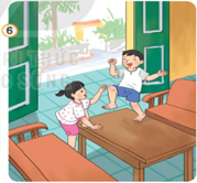 Hai bạn nhỏ đang nhảy trên bàn, làm như vậy sẽ làm bàn bẩn, nhanh hỏng và hai bạn nhỏ cũng có thể bị thương nếu ngã.