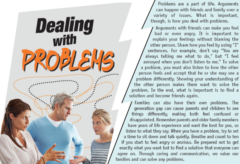 1. Look at the picture and the title. What information do you think the text will provide? How do you think the people feel? Listen/Watch and read to find out. 2. Read the text again and decide if each of the statements (1-5) is T (true) or F (false). 3. Find the adjectives of feelings and emotions in the text. 4. How do teens in your country deal with problems? Collection information and prepare a presentation. Present it to the class.
