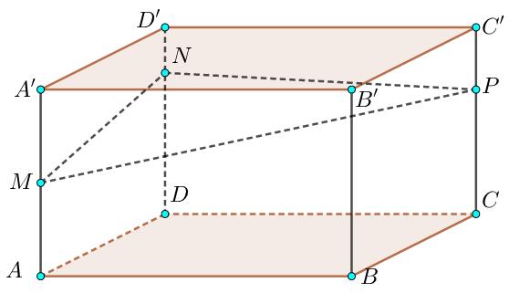 Câu 7. Cho khối hộp chữ nhật \(ABCD.A’B’C’D’\) có thể tích bằng \(2110\). Biết \(A’M = MA\); \(DN = 3ND’\); \(CP = 2PC’\). Mặt phẳng \(\left( {MNP} \right)\) chia khối hộp đã cho thành hai khối đa diện. Thể tích khối đa diện nhỏ hơn bằng