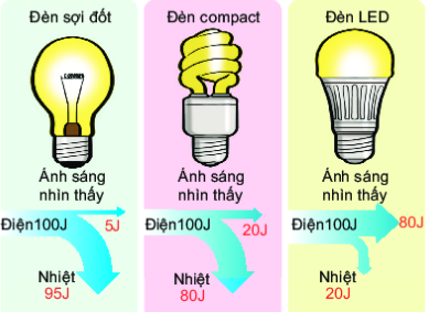 Hình vẽ dưới đây thể hiện hiệu quả thắp sáng của đèn sợi đốt, đèn compact và đèn LED. Em hãy cho biết đèn nào có hiệu quả thắp sáng lớn nhất?