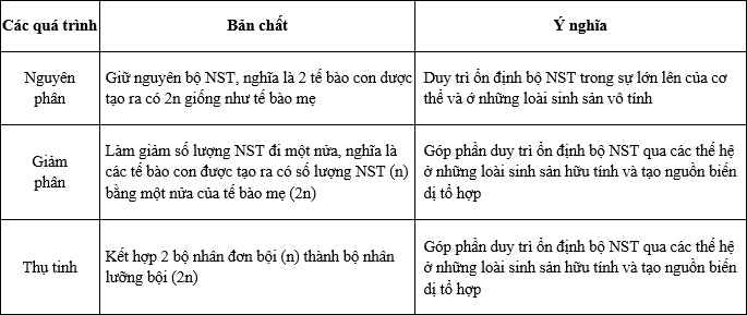 Câu 1. hoàn thành bảng sau về bản chất và ý nghĩa của các quá trình nguyên phân, giảm phân và thụ tinh.