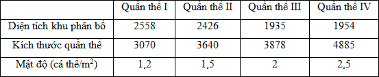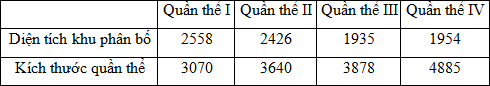 Câu 19. Giả sử kết quả khảo sát về diện tích khu phân bố (tính theo m2) và kích thước quần thể (tính theo số lượng cá thể) của 4 quần thể sinh vật cùng loài ở cùng một thời điểm như sau: