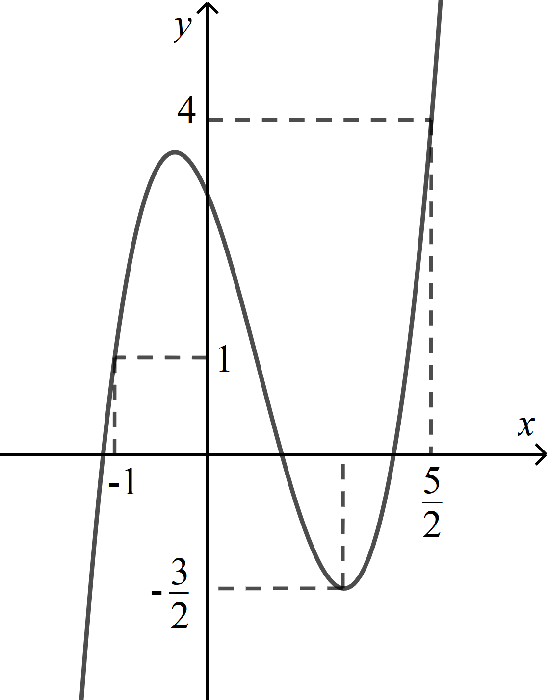Câu 3. Cho hàm số \(y = f(x)\) xác định, liên tục trên \(\left[ { – 1;\,\,\frac{5}{2}} \right]\) và có đồ thị là đường cong như hình vẽ .