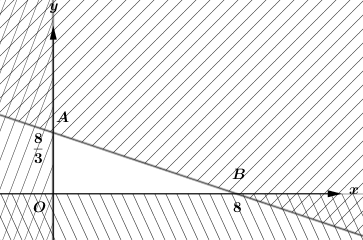 Miền nghiệm là tam giác OAB (phần không bị gạch, kể cả bờ là các cạnh của tam giác OAB), với \(O\left( {0;0} \right)\), \(A\left( {0;\dfrac{8}{3}} \right)\), \(B\left( {8;0} \right)\).