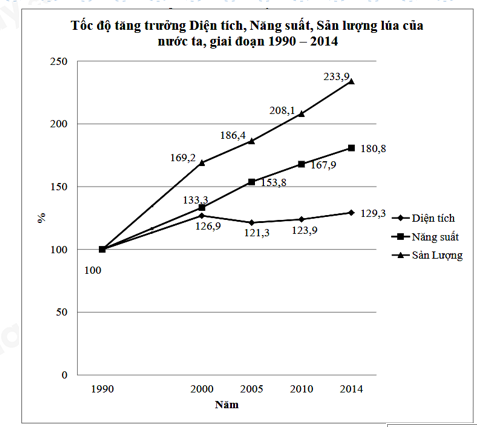 Bài 1. (2 điểm) Tốc độ tăng trưởng Diện tích, Năng suất, Sản lượng lúa của nước ta, giai đoạn 1990 – 2014 được biểu diễn qua biểu đồ dưới đây: