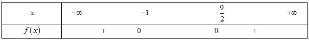 Dựa vào bảng xét dấu ta có: \(f\left( x \right) = 2{x^2} – 7x – 9 < 0\)\( \Leftrightarrow {\rm{ \;}} – 1 < x < \frac{9}{2}\)