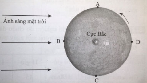 Hình 2 cho thấy hình ảnh Trái Đất khi ta nhìn từ cực Bắc, chiều quay Trái Đất và hướng ánh sáng từ Mặt Trời chiếu tới. Em hãy kể tên các thời điểm trong ngày (Bình minh, hoàng hôn, giữa trưa, ban đêm) tương ứng với các vị trí A, B, C, D.