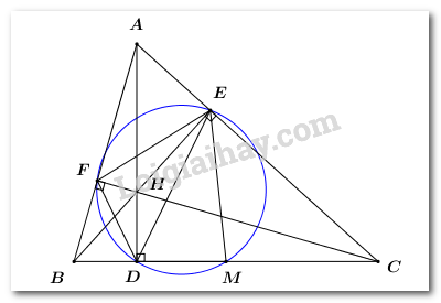 Gọi \(M\) là trung điểm của \(BC\), ta sẽ chứng minh tú giác \(DMEF\) là tứ giác nội tiếp.