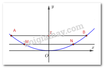 Ta gắn trục tọa độ của parabol và các điểm M, N vào hệ trục tọa độ \(Oxy\) với \(Oy\) là tia \(OF\) và \(Ox\) là tia thuộc đường thẳng vuông góc với \(OF\) tại \(O\) để giải bài toán.