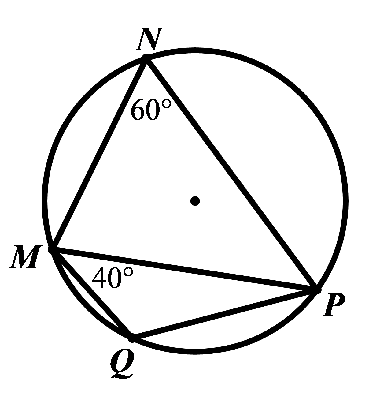 Câu 10. Cho tứ giác \(MNPQ\) nội tiếp một đường tròn. Biết \(\angle MNP = {60^0},\angle PMQ = {40^0}\). Số đo \(\angle MPQ\) bằng: (Tham khảo hình vẽ)