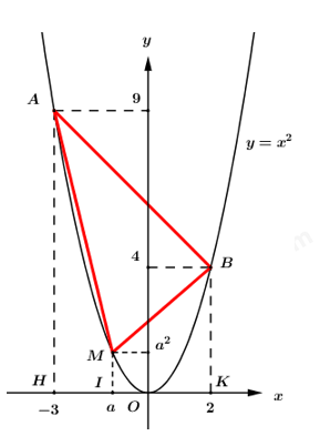 Cho parabol \(\left( P \right):\,\,y = {x^2}\) và hai điểm \(A\left( { – 3;9} \right)\), \(B\left( {2;4} \right)\). Tìm điểm \(M\) có hoành độ thuộc khoảng \(\left( { – 3;2} \right)\) trên \(\left( P \right)\) sao cho diện tích tam giác \(MAB\) lớn nhất.