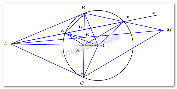 b) Chứng minh rằng \(A{B^2} = AE.AF\) và \(\angle OEF = \angle OHF,\) với \(H\) là giao điểm của \(AO\) và \(BC.\)