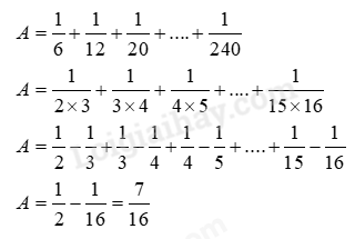 Câu 32. Tính $A = \frac{1}{6} + \frac{1}{{12}} + \frac{1}{{20}} + …. + \frac{1}{{240}}$