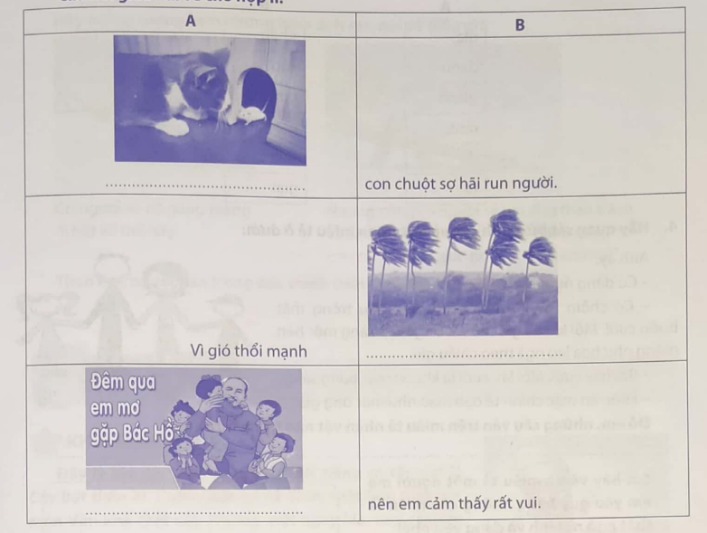 Dựa vào các hình ảnh gợi ý dưới đây, viết thêm về câu ở cột A hoặc B, dùng dấu câu nối giữa hai vế cho hợp lí.