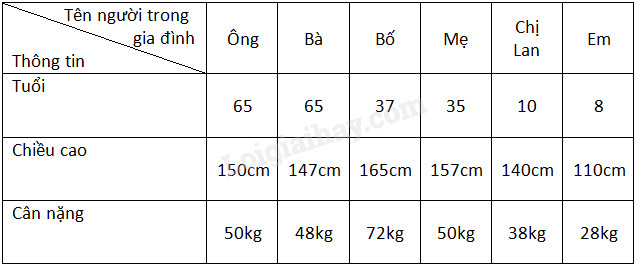 Em hãy thống kê rồi ghi số tuổi, chiều cao, cân nặng của từng người trong gia đình em vào bảng sau :