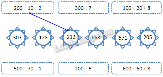 Tìm giá trị của tổng các số trăm, chục, đơn vị rồi nối hai ô có cùng giá trị.