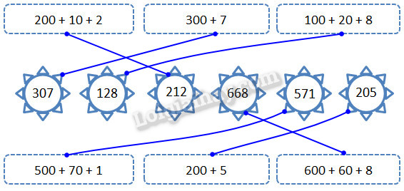 Tìm giá trị của tổng các số trăm, chục, đơn vị rồi nối hai ô có cùng giá trị.